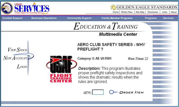 This section was an online ordering system for video tapes produced by the Agency. This allowed other services organizations to access accounts and see information similar to any existing online ordering site.